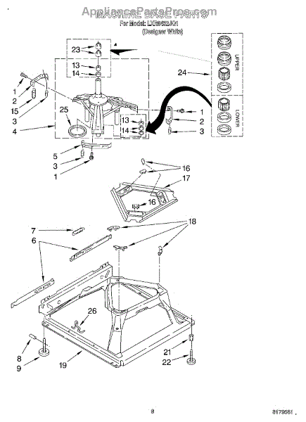 Used for direct drive washing machines. Complete assembly includes 2 level mechanism links, 1 level mechanism spring, 1 knurled pin, 2 rear feet, 1 pad plate, 1 suspension plate, 1 base pad, and 1 suspension spring retainer.