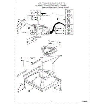Used for direct drive washing machines. Complete assembly includes 2 level mechanism links, 1 level mechanism spring, 1 knurled pin, 2 rear feet, 1 pad plate, 1 suspension plate, 1 base pad, and 1 suspension spring retainer.
