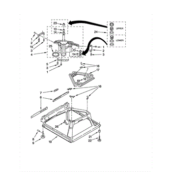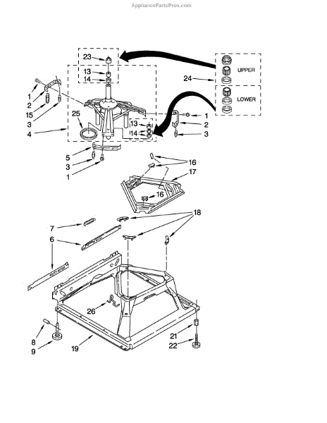 Used for direct drive washing machines. Complete assembly includes 2 level mechanism links, 1 level mechanism spring, 1 knurled pin, 2 rear feet, 1 pad plate, 1 suspension plate, 1 base pad, and 1 suspension spring retainer.