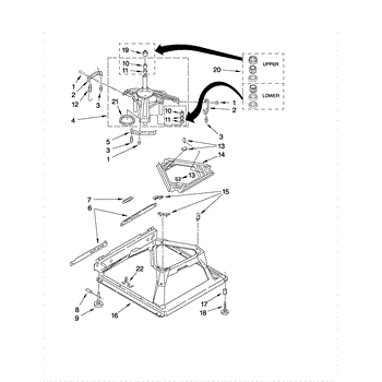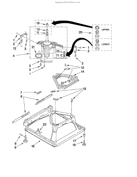 Used for direct drive washing machines. Complete assembly includes 2 level mechanism links, 1 level mechanism spring, 1 knurled pin, 2 rear feet, 1 pad plate, 1 suspension plate, 1 base pad, and 1 suspension spring retainer.