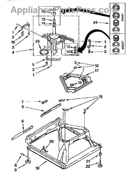 Secures suspension springs to the washer tub assembly. Replace if cracked, worn, or missing to prevent tub instability during wash and spin cycles.