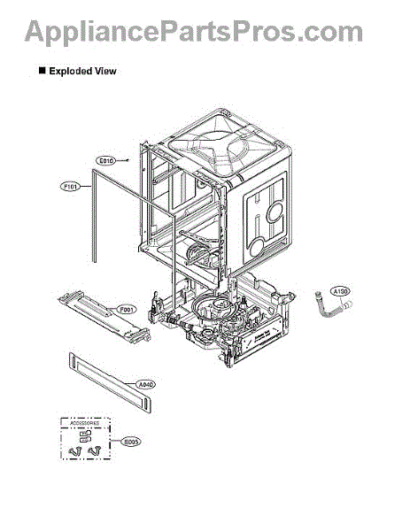 Parts assembly for dishwashers. Replaces damaged, broken, or missing assembly components. Essential for restoring proper function and appearance.