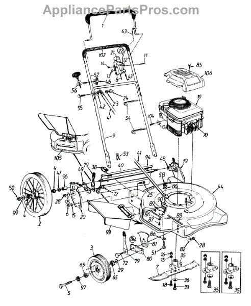 This is the front wheel assembly that is used by a large number of manufactures as the standard wheel for push mowers. This wheel is a tough, black rubber wheel fitted onto a sturdy white chassis. Since it is not a pneumatic wheel, there is no concern that it will roll over hidden debris and be damaged. Push wheels such as these often last the lifetime of a Lawn Mower. However, there are occasions when the housing of the mower is dropped and the wheel becomes warped or broken. It's also the case that, with constant use, the wheels can lose tread, making them harder to maneuver in tough mowing conditions. It has also been reported that the tires will wear and become smaller in circumference over time, meaning it will require more gasoline to mow the same amount of yard. The front wheels are easily replaced. After removing the plug cap and stabilizing the mower, simply use a socket wrench to remove the center bolt from the wheel. It's a good idea to use a dry lubricant like graphite on the axle before replacing it. This OEM guaranteed replacement part is compatible with Ryobi, Yard Machines, Troy-Bilt, Cub Cadet, Husky, Yard-Man, and MTD push mowers.