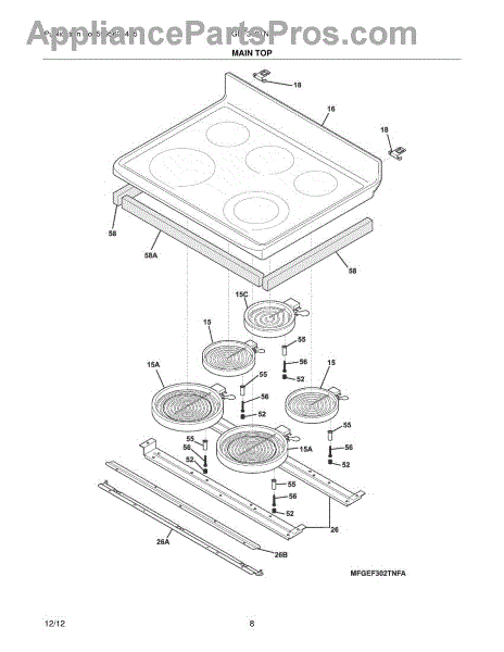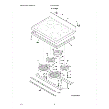 This main top assembly is the replacement cooktop surface that covers and supports the burners and control area, restoring a sealed, stable surface for safe cooking and cleanup. Fits in place of a damaged, warped, or corroded top. What it does: