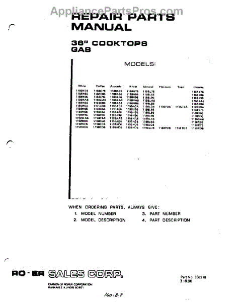 Parts for Whirlpool 1188^A6: 01 - Main Top Parts