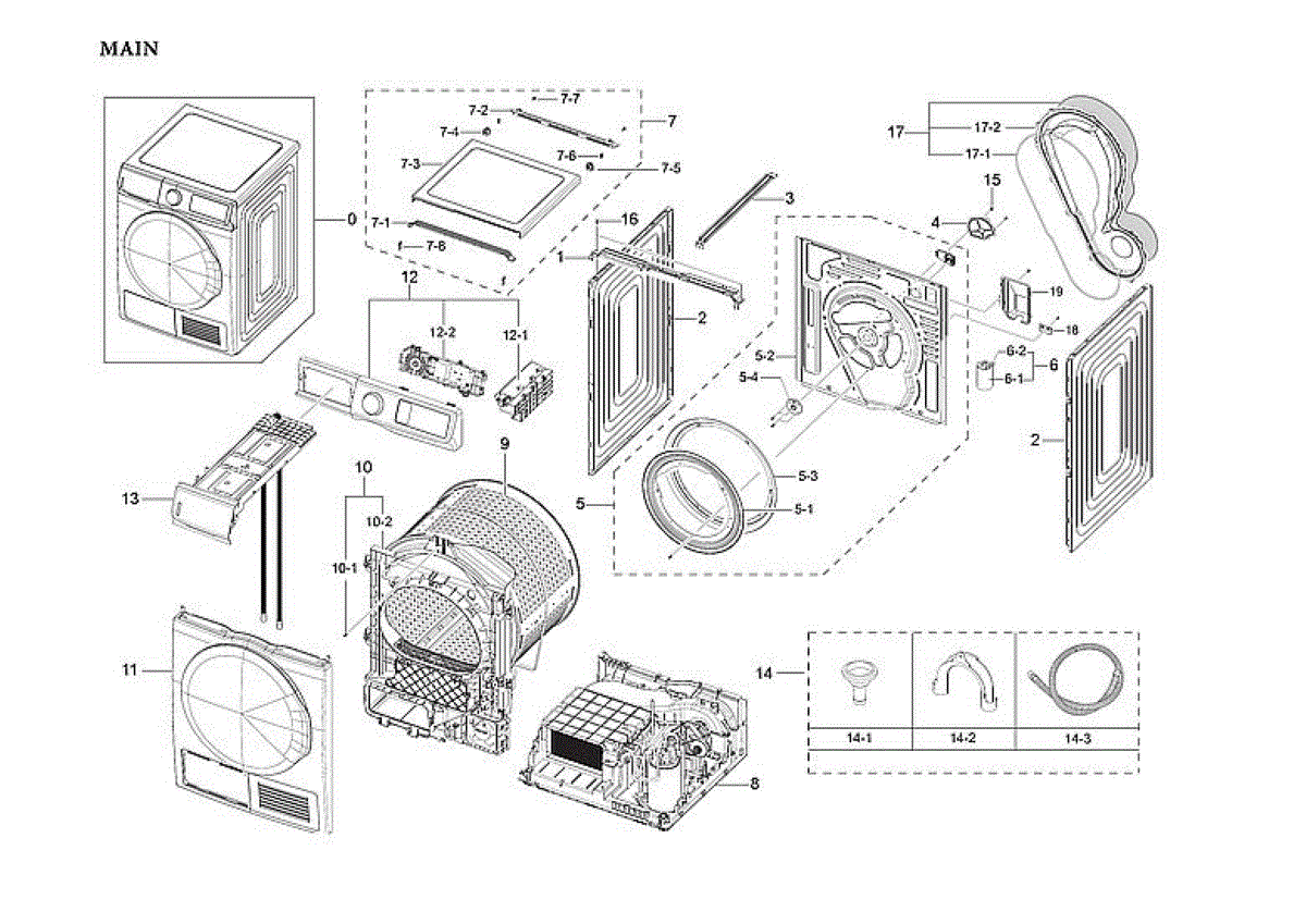 Drain hose assembly for dryers. Connects to the dryer drum to channel condensation water. Replace if cracked, leaking, or disconnected from drain port.