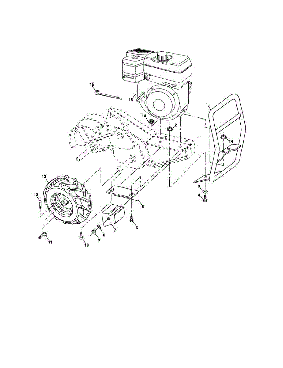 Replacement tire and rim assembly for tillers. Installs on the axle to provide traction and mobility. Replace if tire is cracked, punctured, worn, or rim is bent.