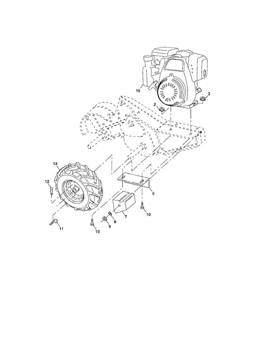 Replacement tire and rim assembly for tillers. Installs on the axle to provide traction and mobility. Replace if tire is cracked, punctured, worn, or rim is bent.