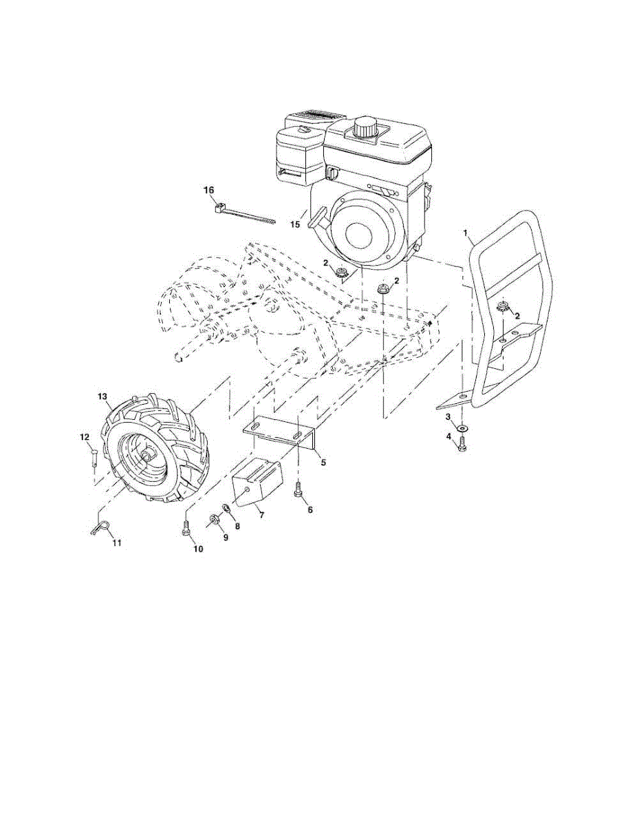 Replacement tire and rim assembly for tillers. Installs on the axle to provide traction and mobility. Replace if tire is cracked, punctured, worn, or rim is bent.