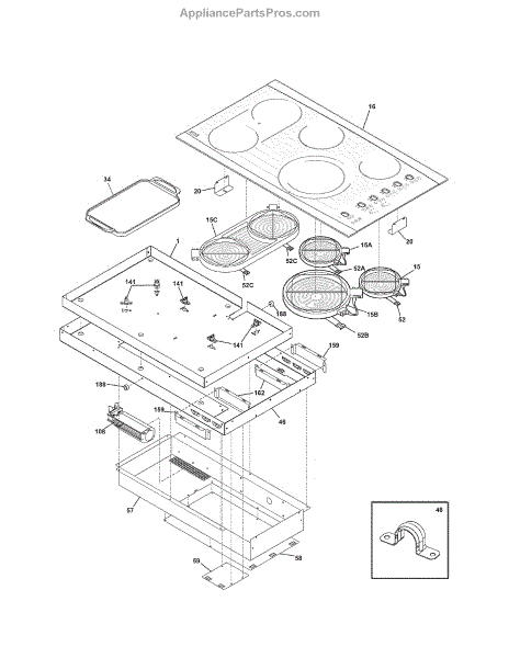 Mounting bracket for electric cooktop installation. Secures cooktop to countertop or cabinet. Replace if bent, broken, or missing for proper support.