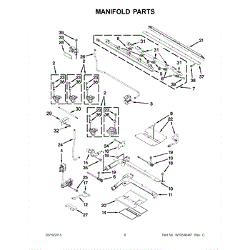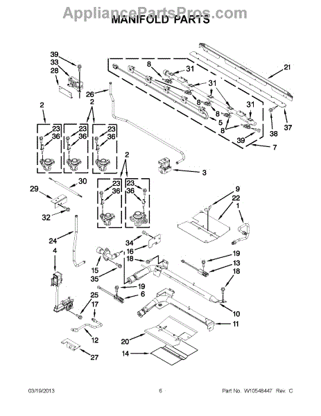 This manifold assembly routes the appliance's gas supply to the burner control valves, restoring safe, consistent distribution when the original tube is cracked, corroded, or leaking. It helps ensure even flame performance across multiple burners. What it does: