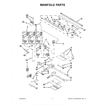 This manifold assembly routes the appliance's gas supply to the burner control valves, restoring safe, consistent distribution when the original tube is cracked, corroded, or leaking. It helps ensure even flame performance across multiple burners. What it does: