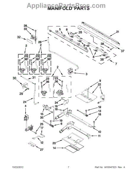 This manifold assembly routes the appliance's gas supply to the burner control valves, restoring safe, consistent distribution when the original tube is cracked, corroded, or leaking. It helps ensure even flame performance across multiple burners. What it does: