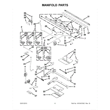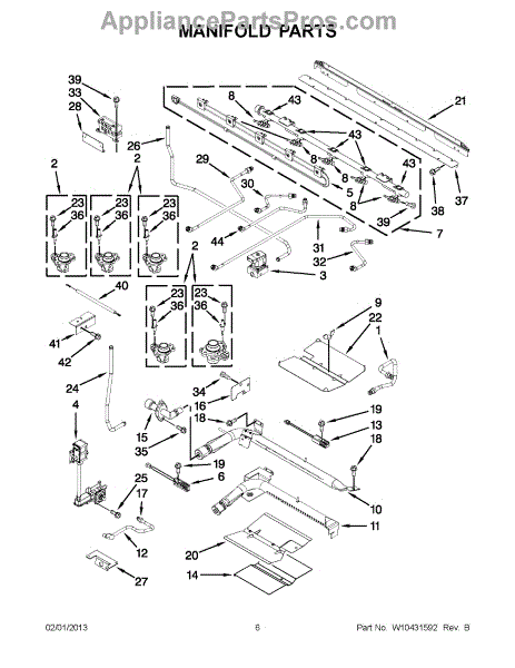 This manifold assembly routes the appliance's gas supply to the burner control valves, restoring safe, consistent distribution when the original tube is cracked, corroded, or leaking. It helps ensure even flame performance across multiple burners. What it does: