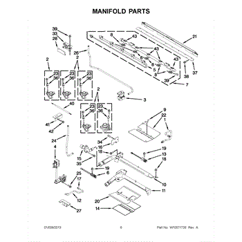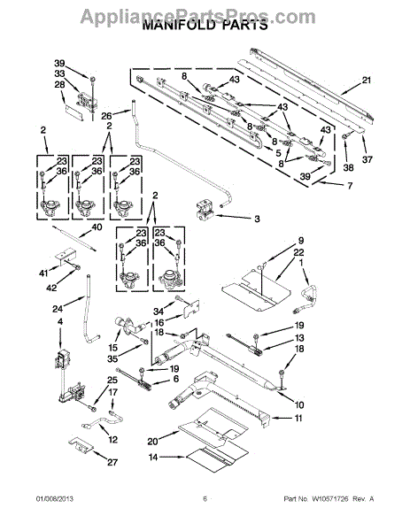 This manifold assembly routes the appliance's gas supply to the burner control valves, restoring safe, consistent distribution when the original tube is cracked, corroded, or leaking. It helps ensure even flame performance across multiple burners. What it does: