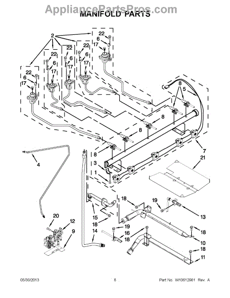 The HOLDER-ORFICE is an OEM component specifically designed for Whirlpool brand gas ranges and cooktops. It serves as the mounting bracket that secures the gas orifice fitting in the proper position. Correct orifice placement is critical for targeted gas flow and optimal flame adjustment.
