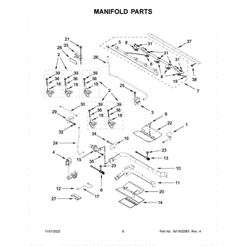 The Manifold is an OEM component for Whirlpool gas ranges. It serves as the main conduit routing gas from the supply line to each burner via individual brass valves. Rugged steel construction ensures durability under appliance pressures and heat.
