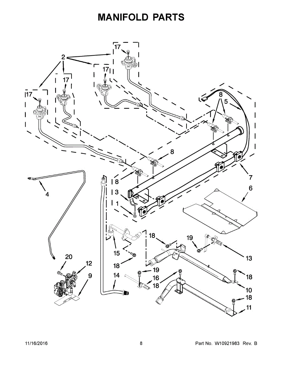 The LP Bake and Broil Orifice Kit is an OEM replacement part for Whirlpool gas ranges and ovens. It is a kit containing specially-sized orifices that control gas flow to the bake and broil burners. This allows for optimal gas-air mixture and fuel efficiency specific to liquefied petroleum (LP) gas systems. Causes of needing a replacement kit include worn or damaged orifices that alter proper gas flow and burner performance over time. Symptoms include: