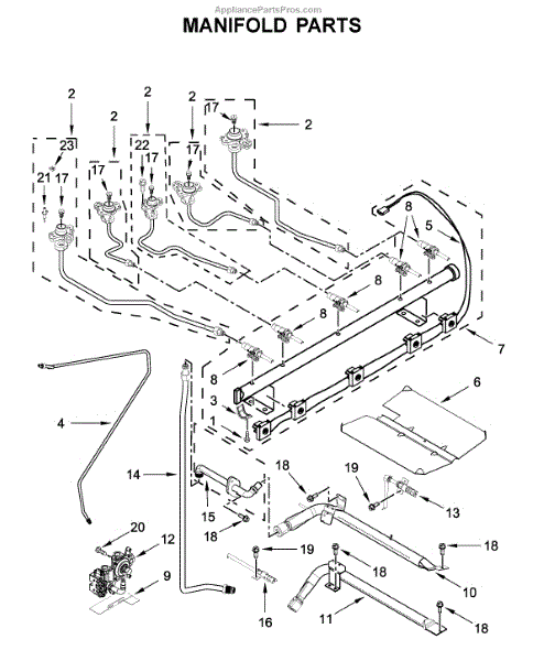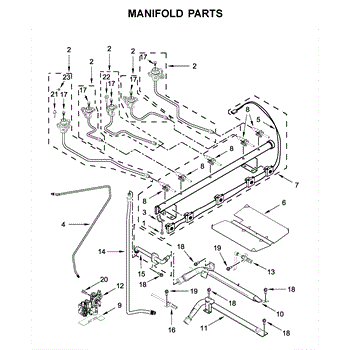 This manifold assembly routes and supports the appliance's internal fluid/air flow so the unit operates reliably. It replaces a worn or damaged manifold to restore proper routing and help prevent leaks or performance issues. What it does