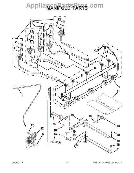 The HOLDER-ORFICE is an OEM component specifically designed for Whirlpool brand gas ranges and cooktops. It serves as the mounting bracket that secures the gas orifice fitting in the proper position. Correct orifice placement is critical for targeted gas flow and optimal flame adjustment.