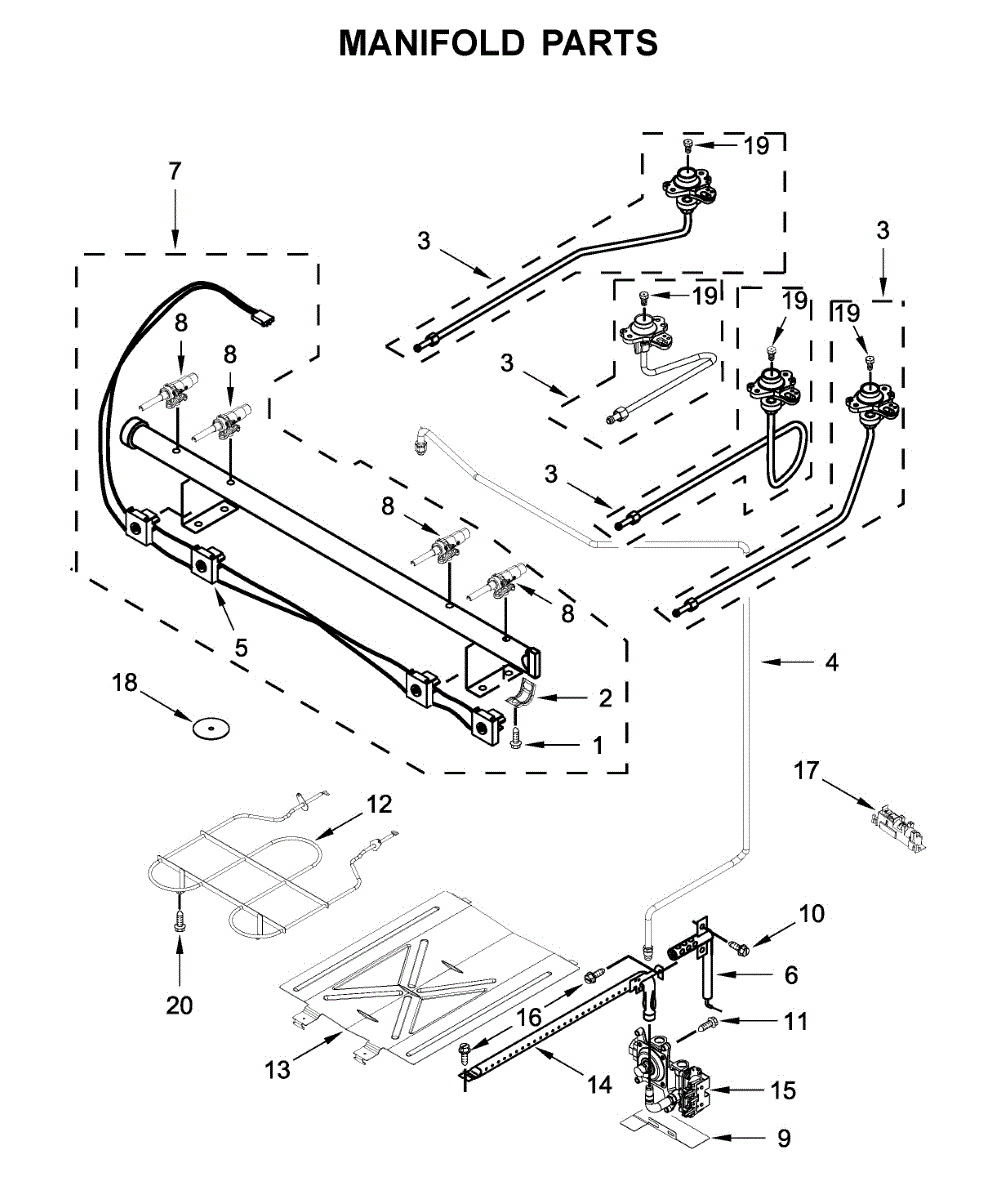 This manifold assembly routes gas to the cooktop's four burners so the range heats correctly. Replaces a damaged or leaking manifold to restore consistent burner ignition and flame delivery. What it does: