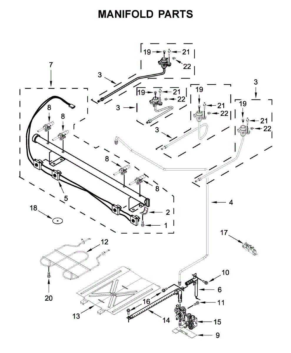 This manifold assembly routes gas to the cooktop's four burners so the range heats correctly. Replaces a damaged or leaking manifold to restore consistent burner ignition and flame delivery. What it does: