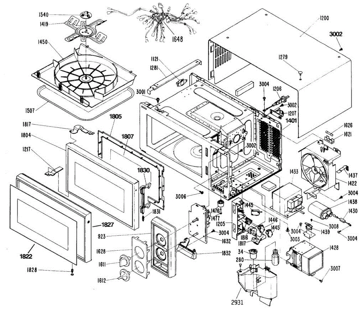 Washered screw secures panels, brackets, and internal microwave components. Replace if screw is missing, stripped, or damaged to restore proper fit.