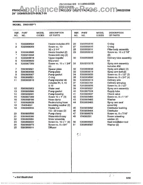Parts for Frigidaire DW5100P*1: Misc. / Literature / Optional Parts