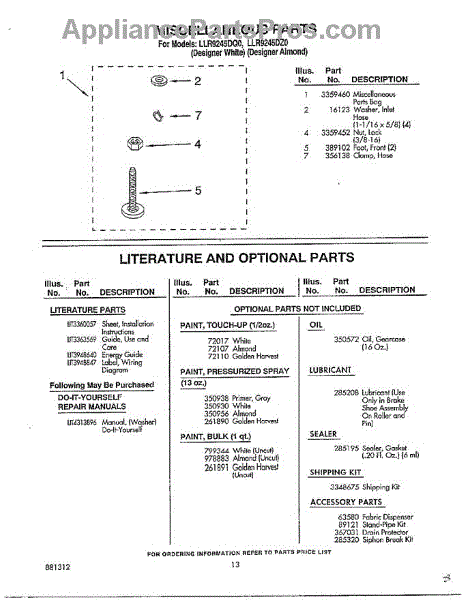 Parts for Whirlpool LLR9245DZO: Misc / Literature And Optional Parts