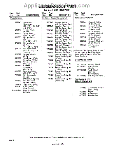 Parts for Whirlpool EHT183VKWR0: 12 - Miscellaneous , Lit / Optional Parts