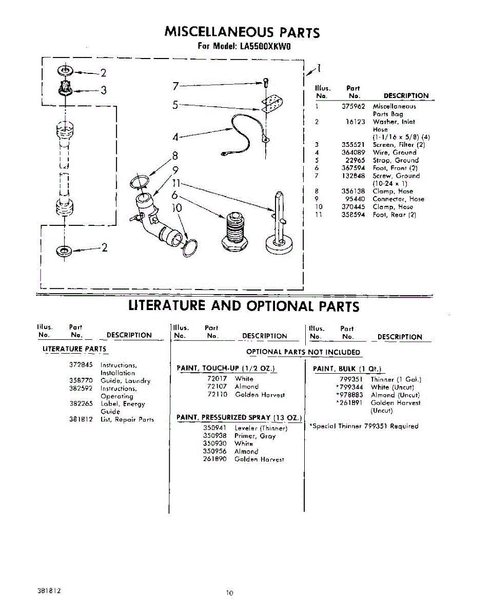 Parts for Whirlpool LA5500XKW0: 10 - Miscellaneous , Literature And Optional Parts