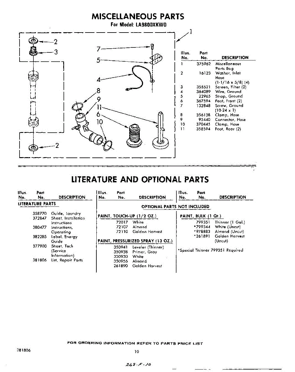 Parts for Whirlpool LA9800XKW0: 10 - Miscellaneous , Literature And Optional Parts