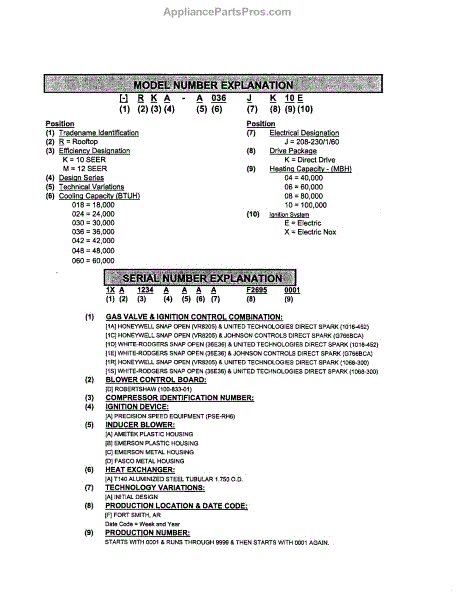 Parts for Ruud URKA-A060: Model And Serial Number Explanation Parts