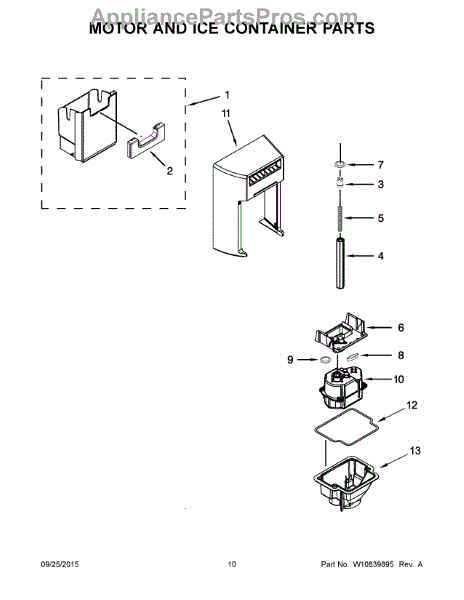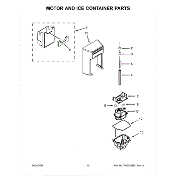 This ice container (ice bin) stores ice made by the icemaker and interfaces with the dispenser drive to deliver cubes or crushed ice. Replacing a cracked or worn bin restores dependable ice storage and dispensing performance.