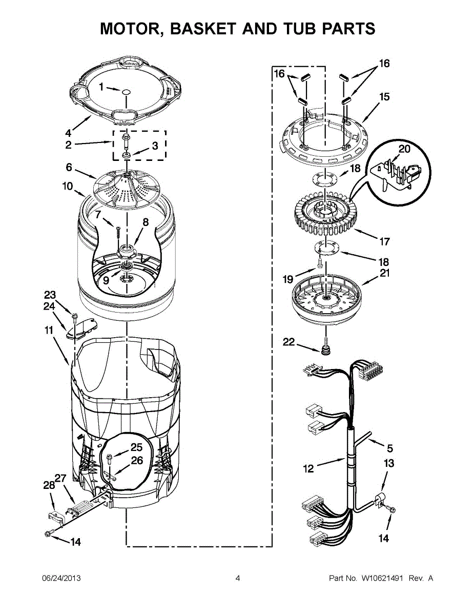Outer tub assembly includes: outer tub, tub seal, drive shaft and bearings. To rebuild the tub, order the bearing and tub seal kit W10435302 and the bearing installation tool W10447783.