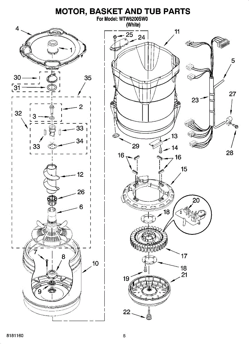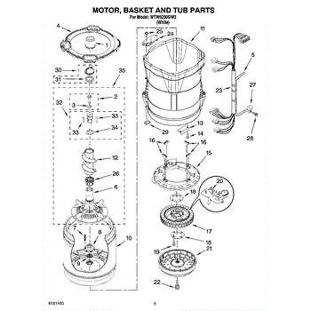 Washer outer tub assembly houses the inner basket and includes bearings and tub seal. Replace when cracked, damaged, or bearings are worn out.