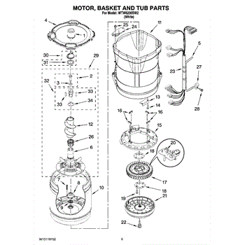 Outer tub assembly includes: outer tub, tub seal, drive shaft and bearings. To rebuild the tub, order the bearing and tub seal kit W10435302 and the bearing installation tool W10447783. When replacing this part, if you see that your motor stator is broken, search by your model number to make sure you get the right stator for your model.