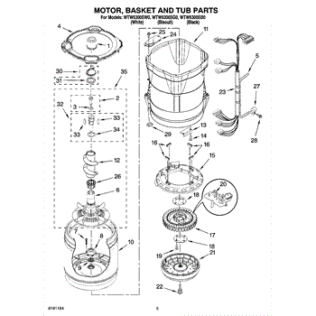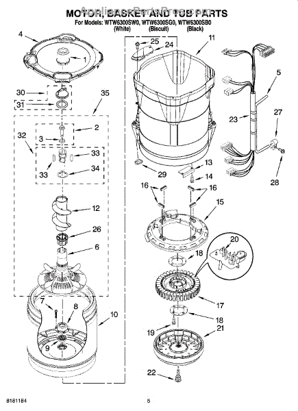 Washer outer tub assembly houses the inner basket and includes bearings and tub seal. Replace when cracked, damaged, or bearings are worn out.