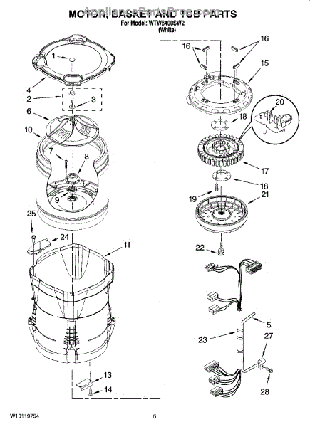 Outer tub assembly includes: outer tub, tub seal, drive shaft and bearings. To rebuild the tub, order the bearing and tub seal kit W10435302 and the bearing installation tool W10447783. When replacing this part, if you see that your motor stator is broken, search by your model number to make sure you get the right stator for your model.