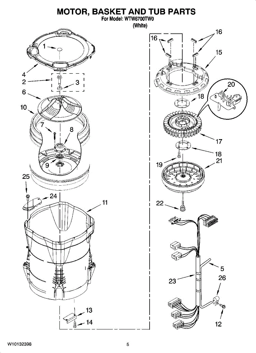 Outer tub assembly includes: outer tub, tub seal, drive shaft and bearings. To rebuild the tub, order the bearing and tub seal kit W10435302 and the bearing installation tool W10447783. When replacing this part, if you see that your motor stator is broken, search by your model number to make sure you get the right stator for your model.