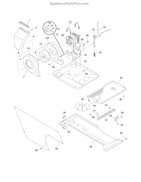 This front blower housing directs airflow from the dryer drum to the vent, helping maintain proper exhaust flow and drying performance. Replace a damaged or cracked housing to prevent air leaks and rubbing against the blower wheel. What it does:
