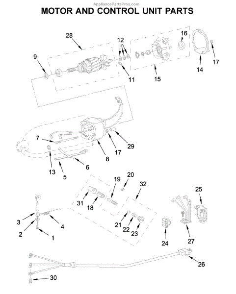 Motor brush holder includes illustration numbers: 28, 32, 33, 34, & 46.