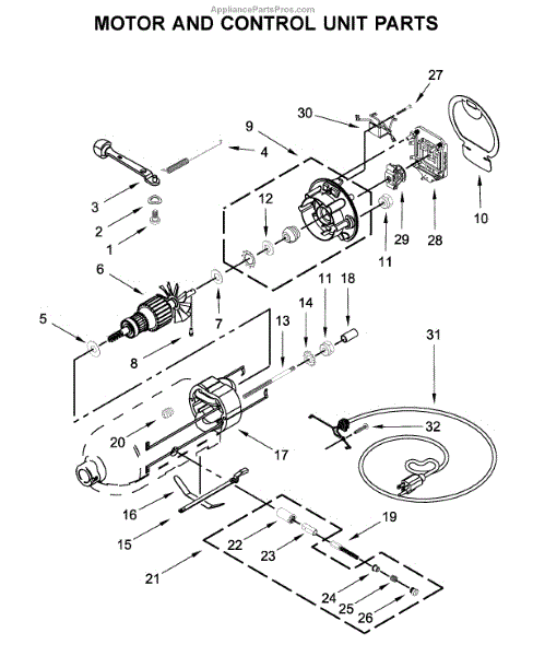 Motor brush holder includes illustration numbers: 28, 32, 33, 34, & 46.