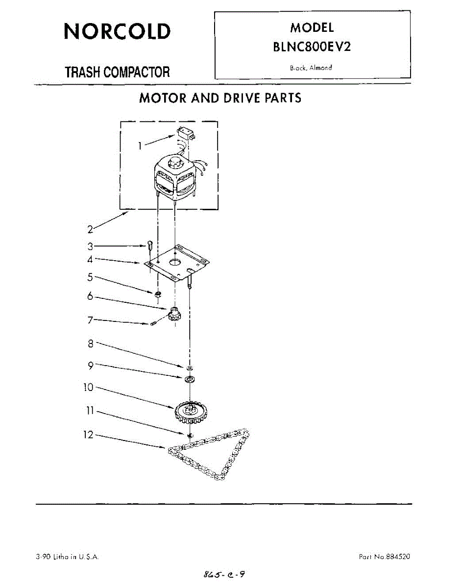 Drive chain connects the motor to the ram mechanism in your trash compactor. Replace if the chain is broken, stretched, or missing to restore compaction function.