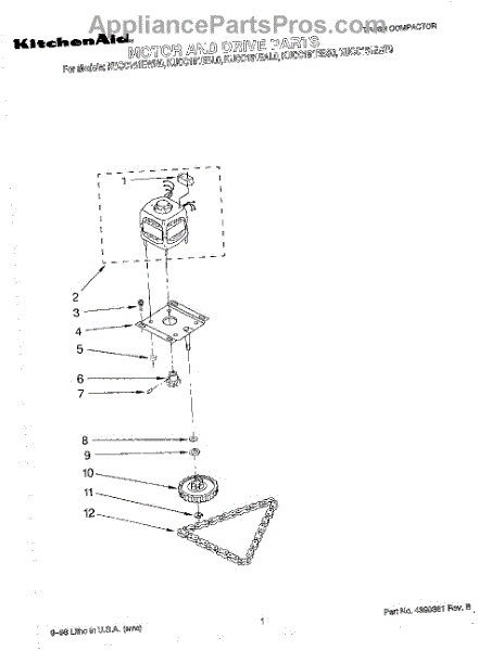 Drive chain connects the motor to the ram mechanism in your trash compactor. Replace if the chain is broken, stretched, or missing to restore compaction function.