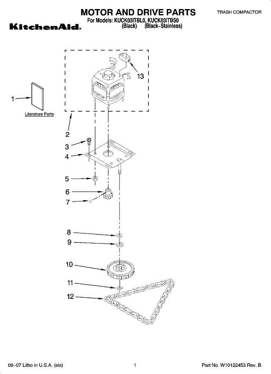 Drive chain connects the motor to the ram mechanism in your trash compactor. Replace if the chain is broken, stretched, or missing to restore compaction function.