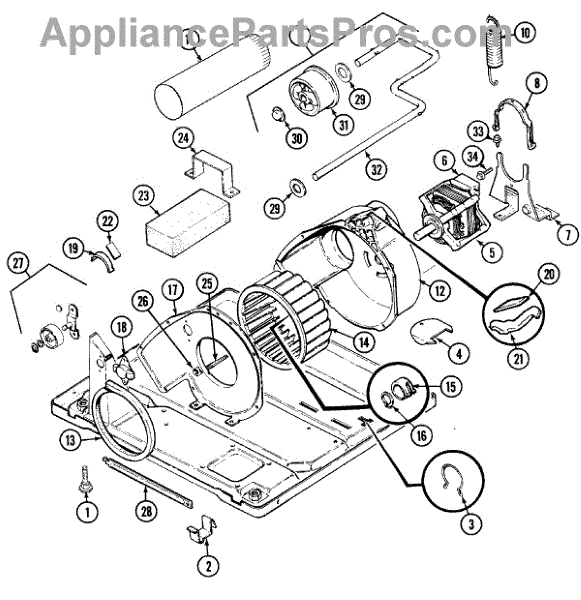 This dryer exhaust fan is used on some Admiral, Crosley, Hoover, Magic Chef, Maytag, Montgomery Ward and Norge brands. Size: 3-1/8 inches deep, 7 1/2 inch fin diameter, 6 3/4 inch hub diameter, 20 standard fins, 1/2 inch diameter motor shaft, 7/16 inch diameter motor shaft to flat side of shaft. Blower wheel clamp not included. For the clamp order 25-7855.