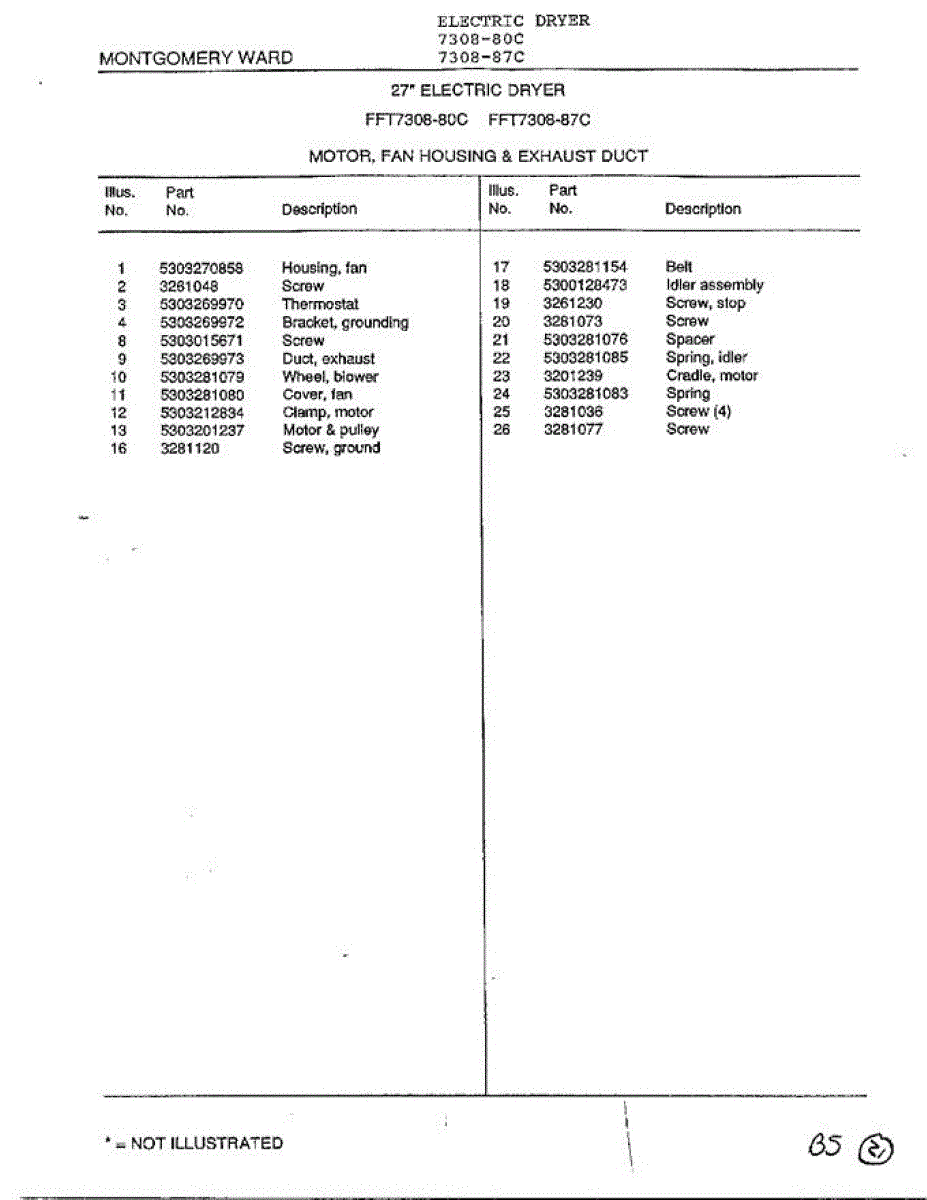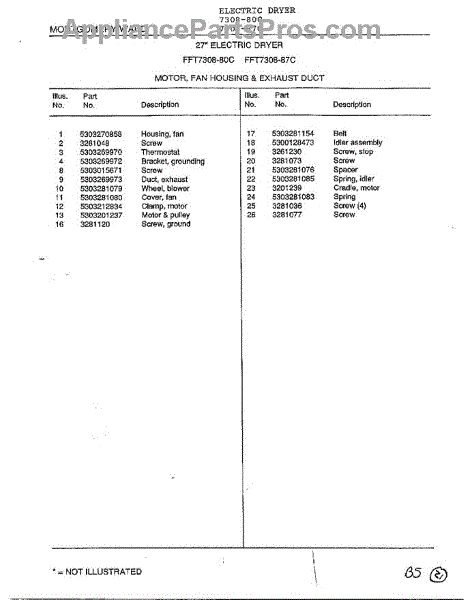 Mounting screw for dryer assembly. Secures internal components and panels. Replace if stripped, missing, or damaged during maintenance or repair work.