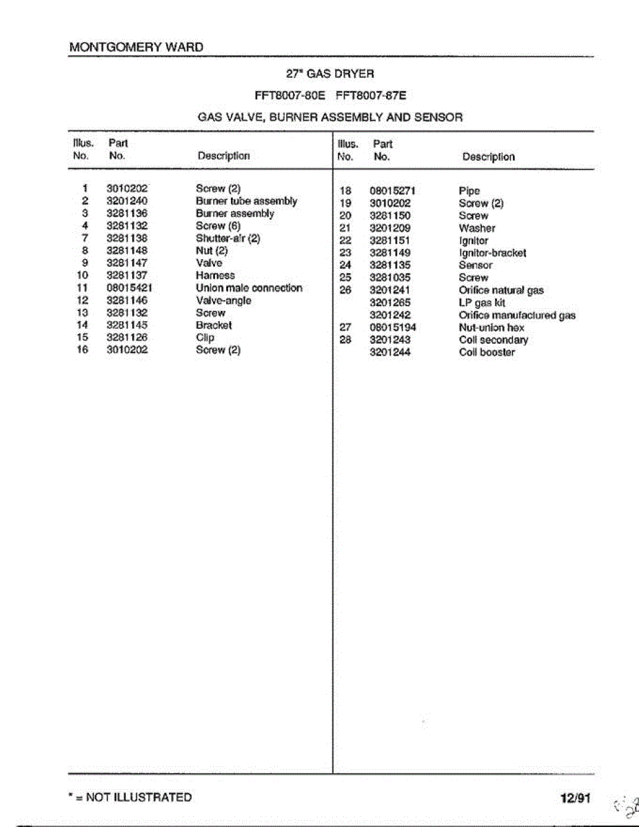 Mounting screw for dryer assembly and panel installation. Replace if stripped, missing, or corroded. Essential hardware for secure component attachment.