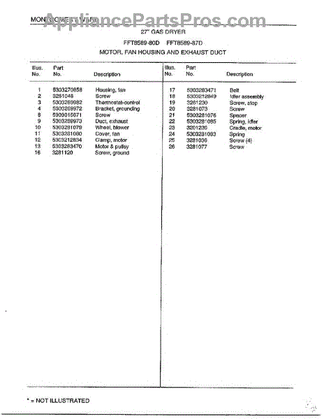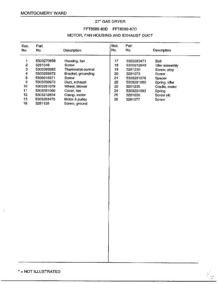Mounting screw for dryer assembly. Secures internal components and panels. Replace if stripped, missing, or damaged during maintenance or repair work.